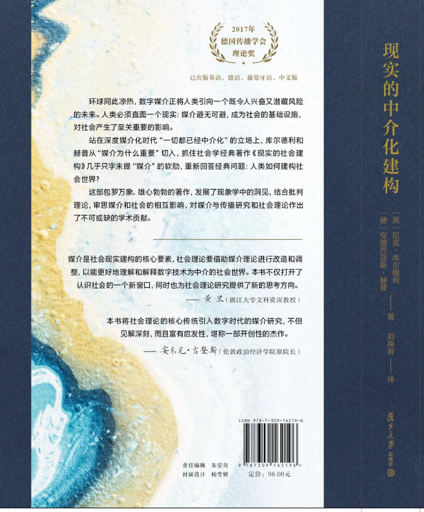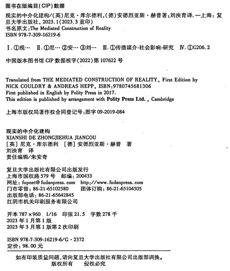 [英]尼克·库尔德利、[德]安德烈亚斯·赫普:《现实的中介化建构》,刘泱育译,上海:复旦大学出版社,2023年1月出版,2023年3月重印。