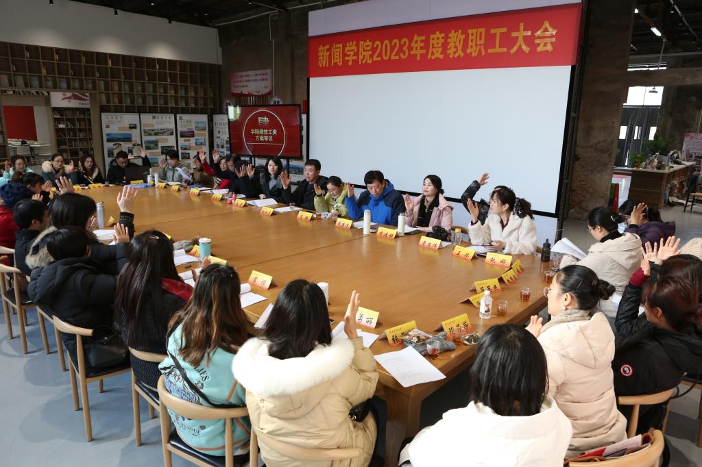 与会教职工对各项报告内容进行认真充分讨论,全体表决审议通过了学院各项工作报告和《新闻学院奖励性绩效工资分配办法(试行)》。