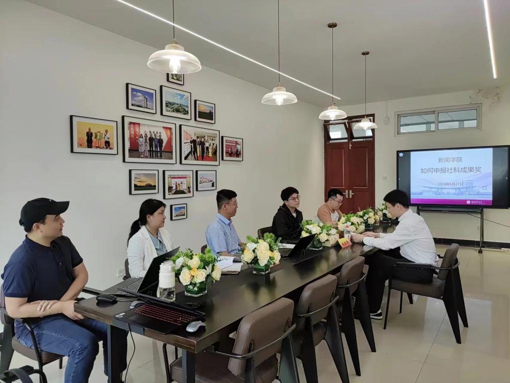 为了更好地提高新闻学院申报江苏省社科成果奖的成功率,5月27日下午,学院在德正楼503会议室召开江苏省社科成果奖申报专题推进会。新闻学院副院长(主持工作)刘泱育老师、院本科教育教学督导赵娜、新闻系主任曹志伟和段永杰三位老师出席。会议由网媒系主任夏羿老师主持。
