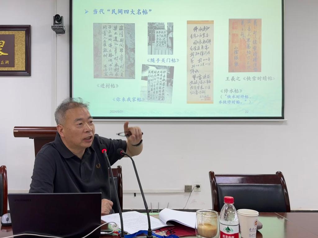 接下来,陈建云老师结合自身理解从“赋予时代内涵”、“进行现代表达”和“融入日常生活”三大部分,分析了“创造性转化”和“创新性发展”的内涵。其中,他认为颜真卿的忠义品格与当前社会主义核心价值观个人层面中的“爱国”高度契合,并通过河南卫视推出的《唐宫夜宴》和《端午奇妙游》等节目进一步分析了中华优秀传统文化是如何进行现代化表达的。在分析“中华优秀传统文化是如何融入日常生活的”过程中,陈建云老师生动形象地讲解了“民间四大帖”。