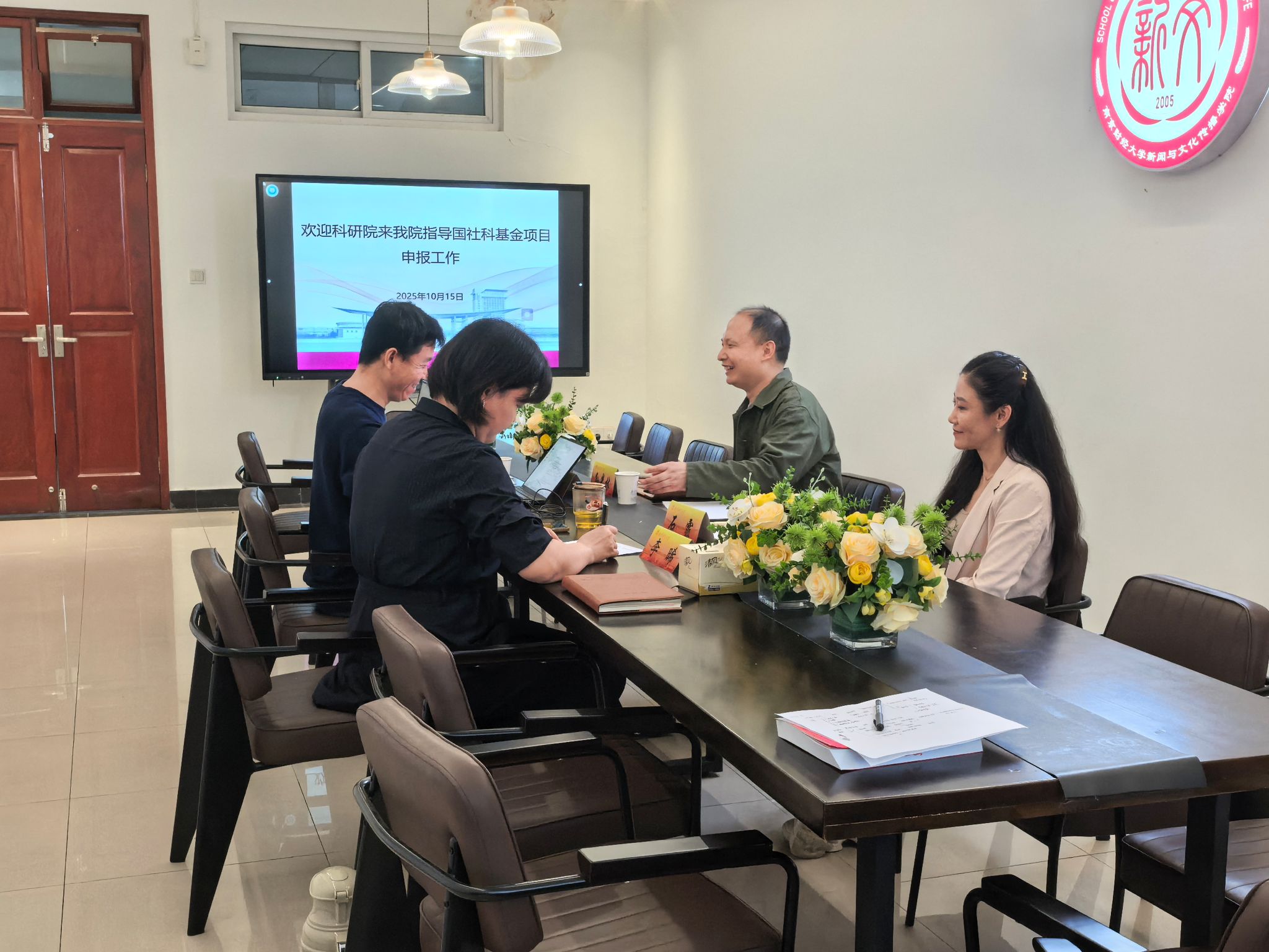 为做好2026年度国家社科基金项目申报工作,10月15日下午,我校科学研究院副院长(挂职)孙光林、社科管理办公室主任石霏来我院开展专题调研指导。我院院长刘泱育、教务科研办主任李晞参加了本次调研会。