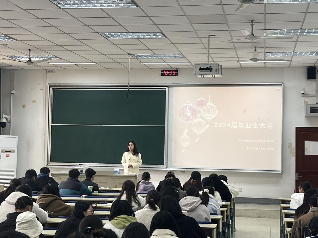 杨柳老师介绍了今年国家和江苏省的就创业政策以及相关的变化,并就签订就业协议流程及注意事项、户档去向以及就业求职过程中的安全着重进行了提醒。并再次强调了同学们按期完成毕业实习、毕业论文和返校后需要提交的材料及注意事项。毕业生会议圆满结束。