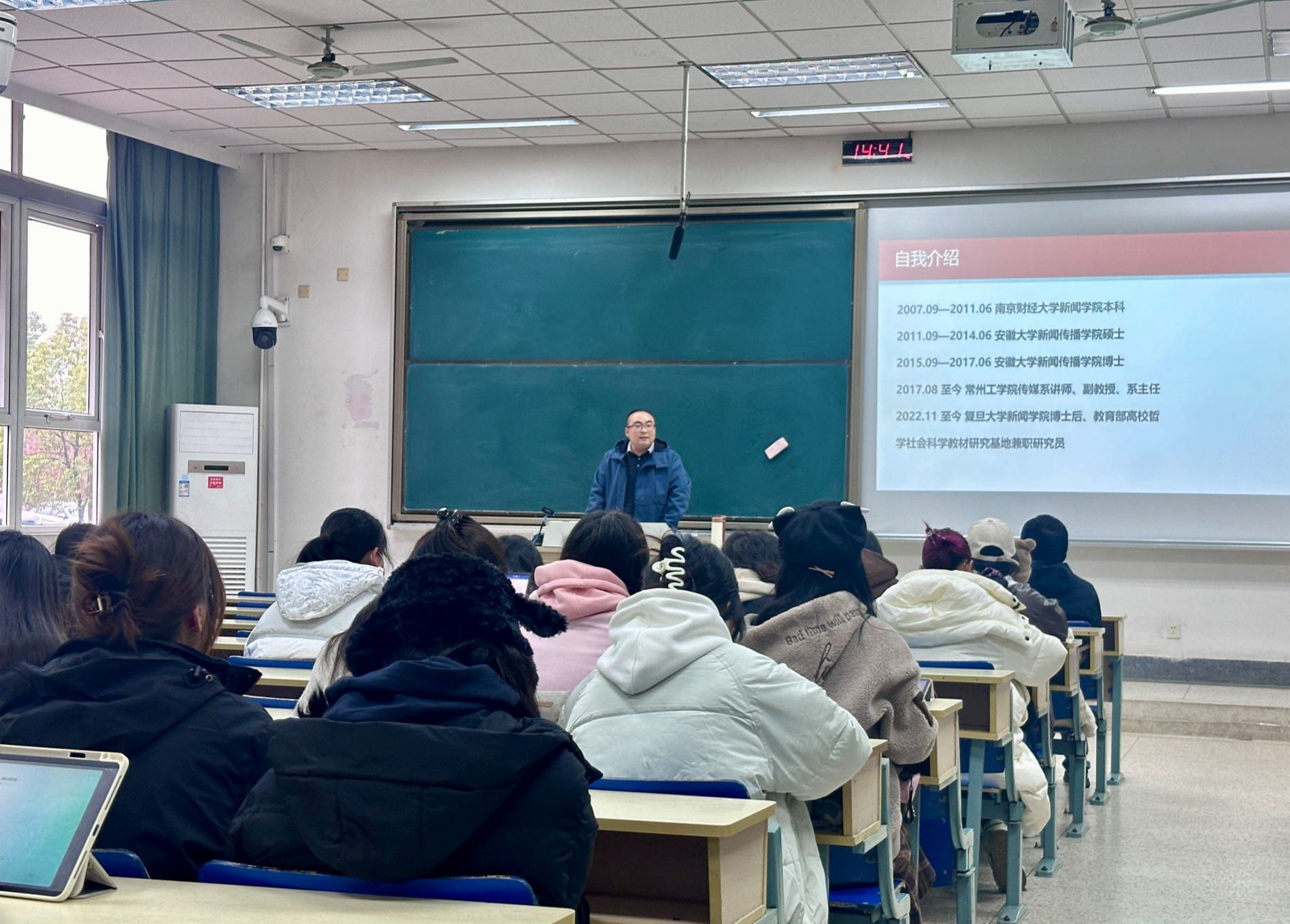 12月4日下午,新闻学院在仙林校区德济楼101教室举办主题为“价值引领数字赋能赛事驱动:新文科背景下卓越新闻传播人才培养的创新与实践”的讲座。常州工学院人文学院传媒系主任、新闻学院07级校友周彤副教授主讲,新闻学院党委副书记李博伟主持,学院2023级全体本科生参加讲座。