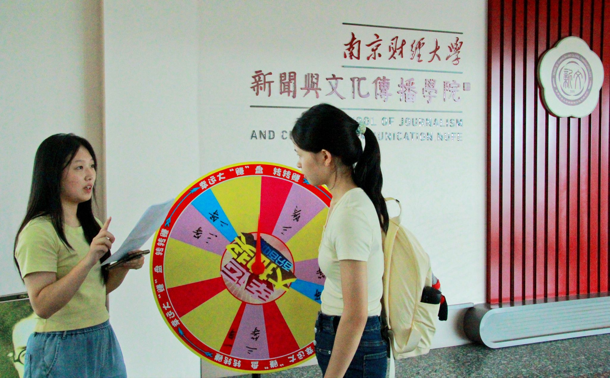 仙林校区德正楼五楼大厅,学院进行了精心布置,巨幅心愿墙上“立好生涯计,未来不焦虑”的标语启迪新生早绘蓝图。新生们纷纷提笔,书写时光期许:勇夺奖学金、投身学生组织、坚持每日阅读……缤纷心愿卡随风轻舞。地面上布置了祝福地贴:“一见倾‘新’是你,满‘新’欢喜是你~”“以热爱为笔,写下独属你的青春注脚!”,为新生入学营造了欢欣热烈的氛围。热闹的迎新场,一轮“新”运大转盘引人驻足,专属“萌新”的开箱仪式巧妙融入的专业趣味问答更添深意:“新闻价值要素知多少?”“传播媒介可曾听闻?”……新生们在欢声笑语间领取奖品,已然经历了别开生面的专业启蒙第一课。