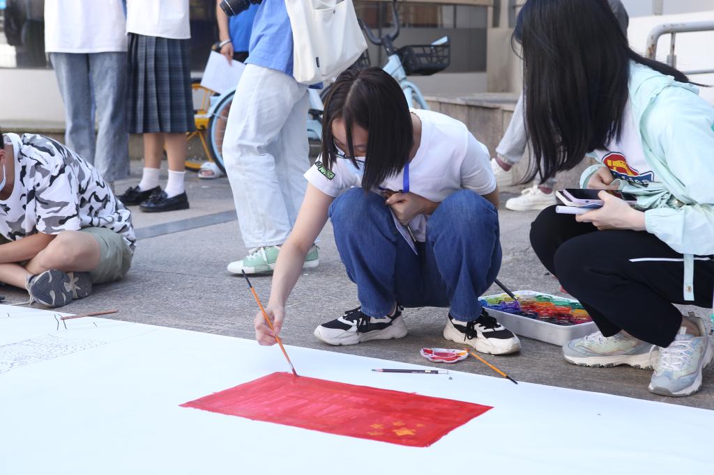活动结束后,同学们齐聚在作品旁一起合影。今日,我们共同迎接国庆、祝福祖国,热血沸腾,心潮澎湃。你我落下的一笔一划,画出了祖国的腾飞;祖国腾飞,将你我画下的一笔一划,都变成了盛世华章。