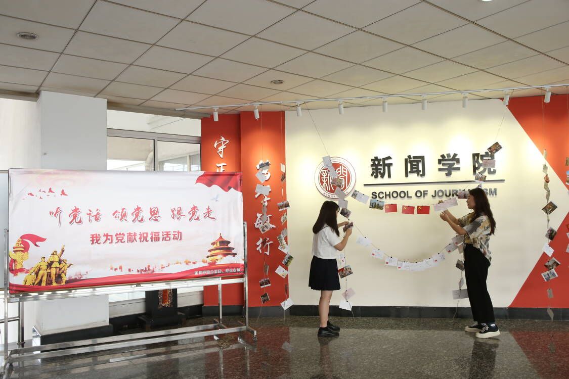 大会结束后,同学们在明信片上写下对于党成立100周年的美好祝福。从嘉兴南湖的小小红船到如今乘风破浪的巍巍巨轮,一个个历史时刻,一段段拼搏故事,见证了百年风雨的光荣,也让人感受到中国共产党的朝气与活力。百年大党,恰是风华正茂之时。新闻学院的学子也正值青春,他们愿意把青春献给党,把最美好的祝福献给党。同学们把写上祝福的明信片挂在了新闻学院的院墙上,用热诚与感恩向党献礼。