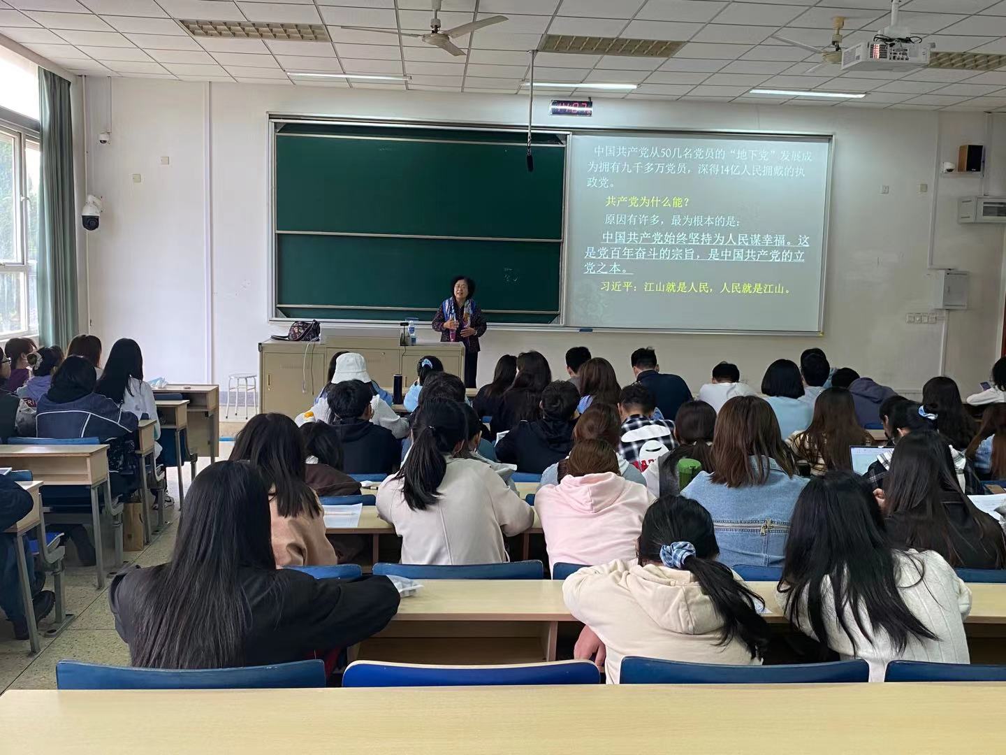 首先,杨教授以“共产党为什么能”这个问题引导同学们思考中国共产党百年征程取得辉煌成就的原因,如习近平总书记所说,江山就是人民,人民就是江山,最为根本的是中国共产党坚持了为人民谋幸福的宗旨。杨教授从三个方面进行了详细论述。一是中国共产党以人民幸福为己任,以为人民谋幸福为最终目标,她分别从土地革命时期,抗日战争时期,解放战争时期,社会主义时期,对比中华人民共和国成立前后的发展,阐释了亿万人民在中国共产党的领导下摆脱阶级剥削压迫走向富裕的历史。二是为人民谋幸福内化为共产党人的坚定信仰和坚强意志。杨教授通过毛泽东同志带领秋收起义部队文家市转兵,朱德同志领导三河坝阻击战等史实,展现了共产党人一心为民不懈奋斗的坚强意志。第三是为人民谋幸福外化为共产党人的无私无畏,使命担当。杨教授重点介绍了党的十八大以来,以习近平同志为核心的党中央全面从严治党,以严的要求、严的标准、严的措施,打赢从严治党攻坚战,实现了党风政风的根本好转。