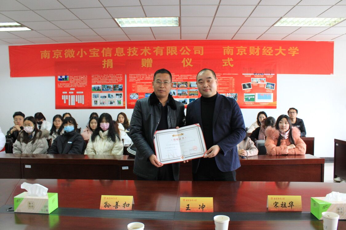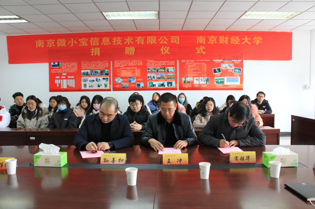 宋祖华院长对参加签约仪式的领导、嘉宾表示欢迎,对南京微小宝信息技术有限公司的捐赠表示衷心感谢,并介绍了新闻学院的发展近况和人才培养情况。孙善扣总经理介绍了南京微小宝信息技术有限公司企业发展的历史和企业文化。南京微小宝信息技术有限公司是国家级高新技术企业,作为我校校友系统的集成运营商,公司与我校校友会长期以来一直保持着良好的合作关系。下一步,公司将与新闻学院合作构建“智慧校友—南财校内运营工作站”,共建一个专业、生态、共享、共赢的互联网运营能力平台,通过平台的模块化、实战式运营,让平台成为新闻学院同学参加社会实践的一个便捷有力的渠道。