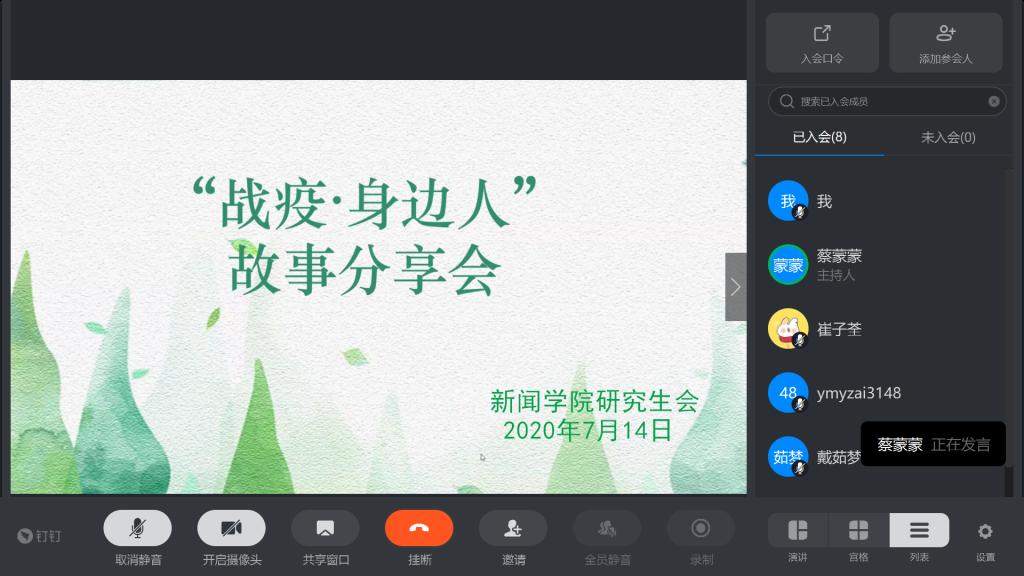 为进一步理解和感悟习近平总书记寄托的新时代中国青年精神,新闻学院于2020年7月14日中午12:20通过钉钉软件举办“党建有我,人人建功”主题系列党日活动之“战疫·身边人”故事分享会,由研究生支部党员及积极分子分享自己身边的“战疫”故事,来让大家共同学习。