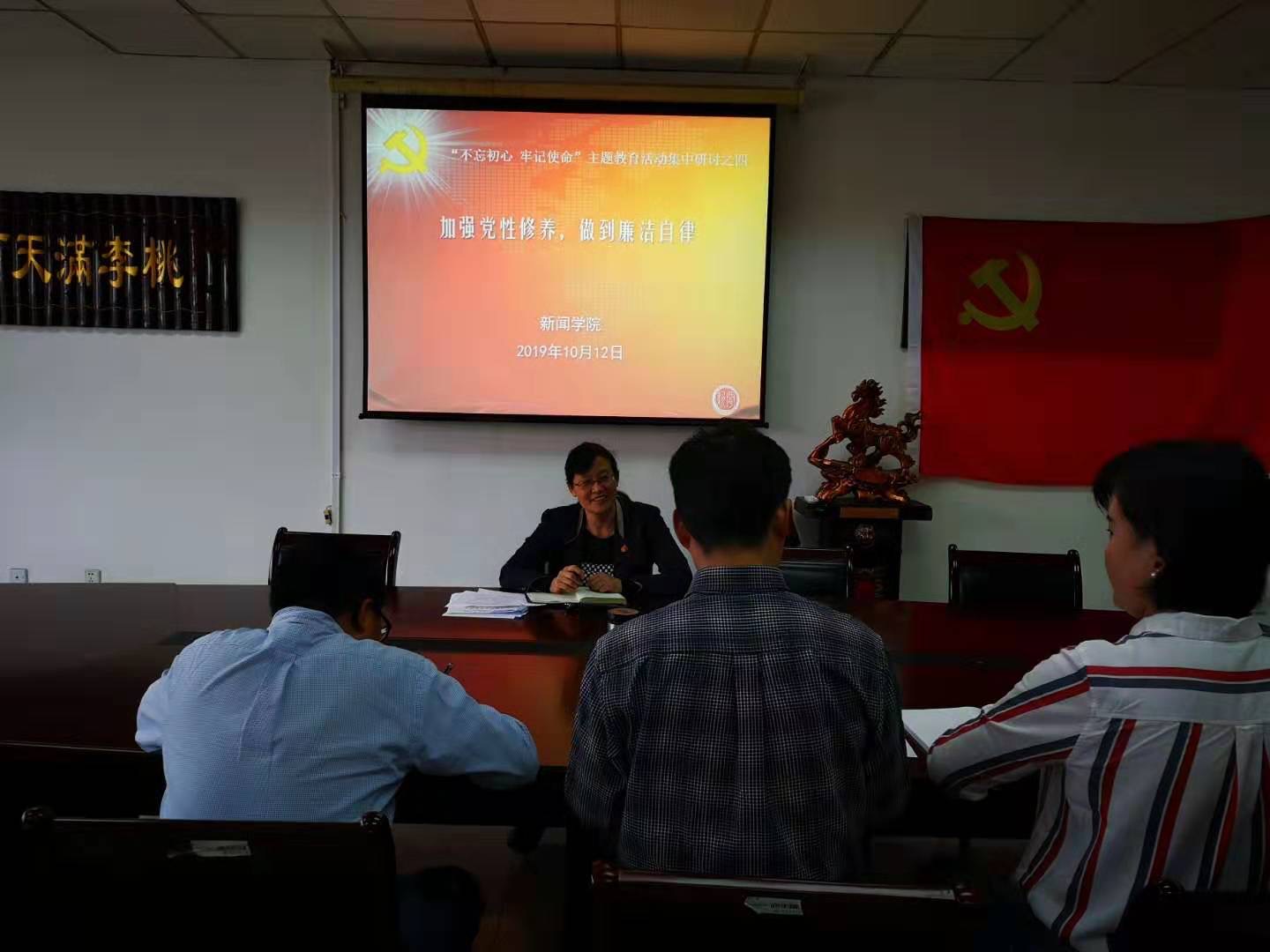10月12日,新闻学院领导班子开展开展“不忘初心、牢记使命”主题教育第四、五次集中学习研讨,主题分别为“加强党性修养,做到廉洁自律”和“全面从严治党,严守政治纪律和政治规矩”。会议由院党总支书记周亚芳主持。
