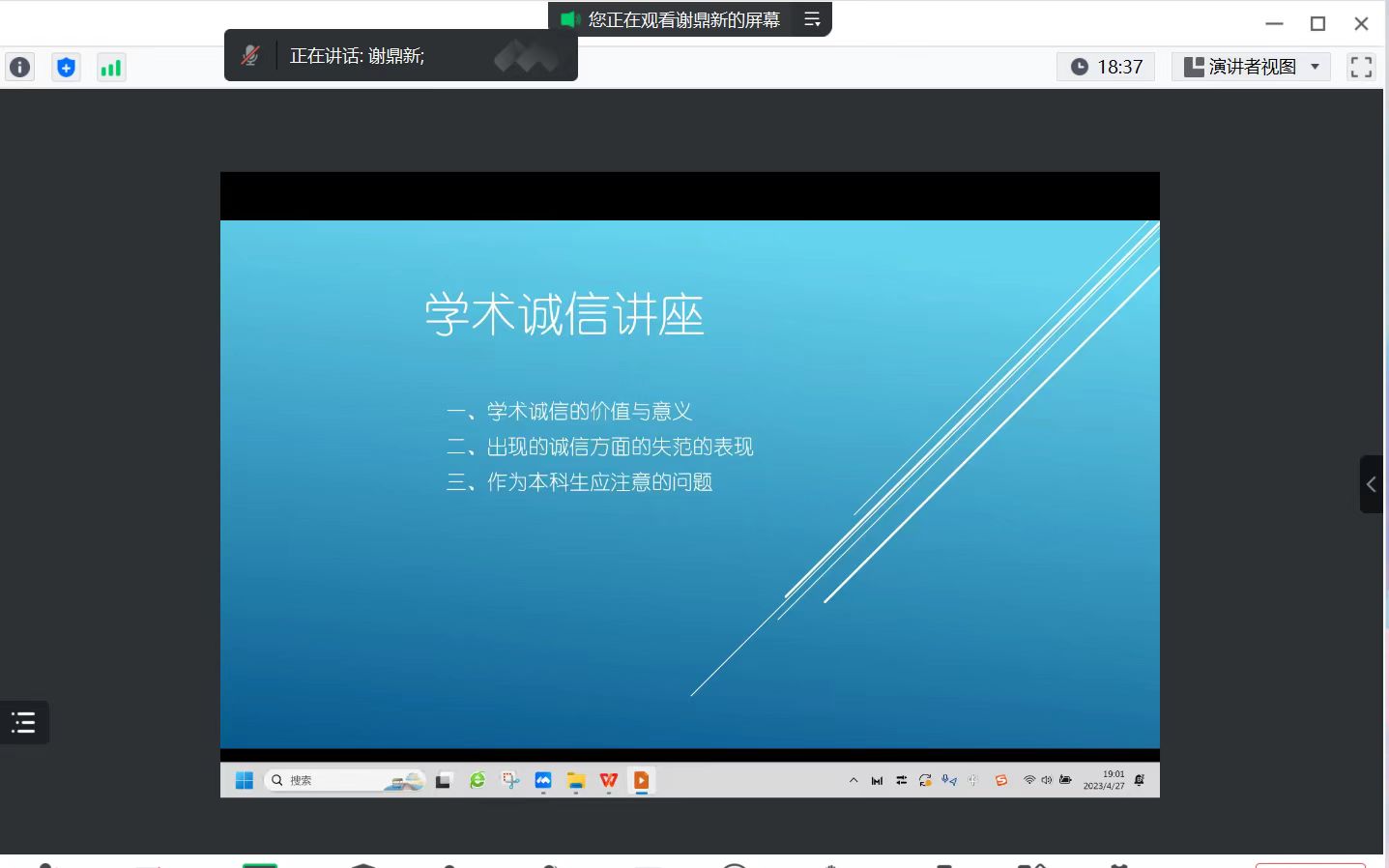 4月27日19:00,新闻学院通过腾讯会议线上开展了2023届本科生毕业论文(设计)诚信教育讲座,新闻学院学术委员会主席谢鼎新教授受邀担任主讲人,2023届全体毕业班学生参加了讲座。此次讲座由教务秘书许云主持。