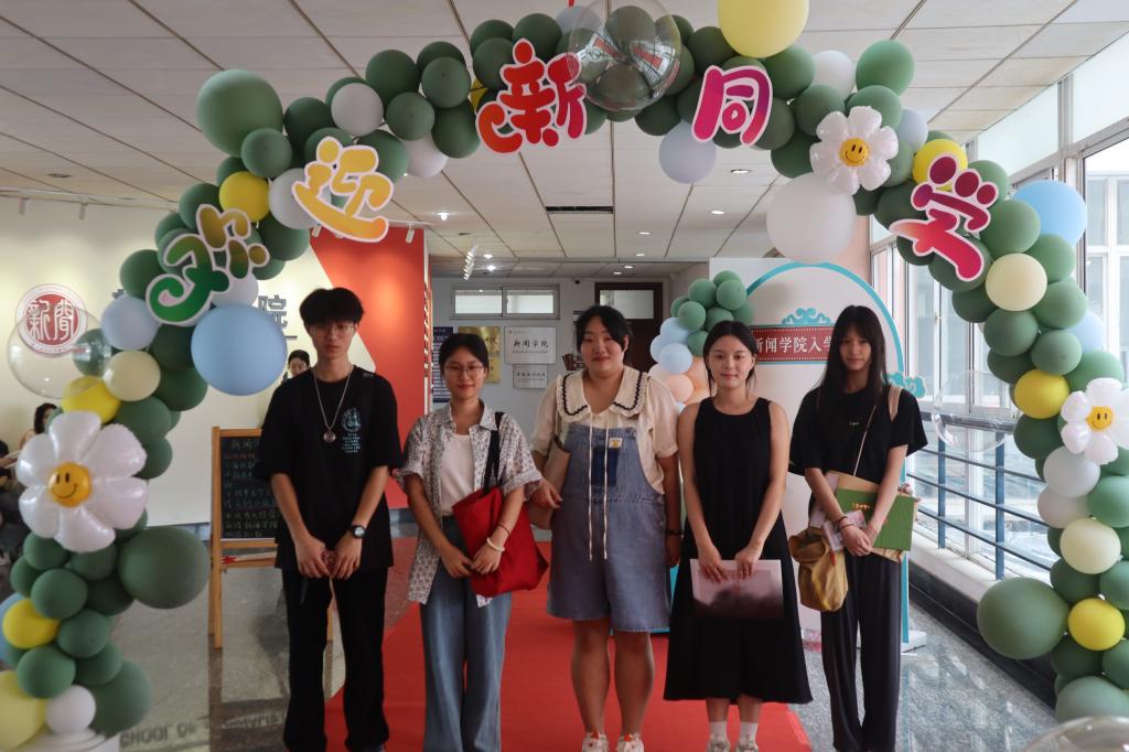 走进学院五楼大厅,映入眼帘的是一个五彩斑斓的气球拱门,拱门上赫然写着“欢迎新同学”五个大字。它标志着每一位走上红毯穿过拱门的新同学,即将在新闻学院开启多彩的崭新未来,也表达了全体师生对新同学未来辉煌人生的美好祝愿。玻璃墙上挂着一条颜色鲜艳的横幅,上面写着“南财拍了拍你说:你是我的‘新’上人”,让人倍感亲切,小萌新们入学的紧张情绪一扫而空。