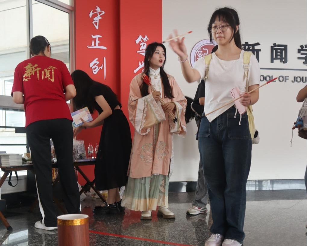 大厅设有传统投壶游戏,作为我国非物质文化遗产,投壶游戏历史悠久。身着精致汉服的学姐们手握壶矢,引导新同学。掌声中,新生们拿起壶矢,瞄准壶口,试探着往前投掷,“好样的!投中了!”这一声声喝彩,令原本初来乍到的胆怯和紧张一扫而光,欣喜涌上心头,投掷得更有力量了!初心不忘,于此启航!投壶成为了新闻学院为新生们准备的意义非凡的入学礼。
