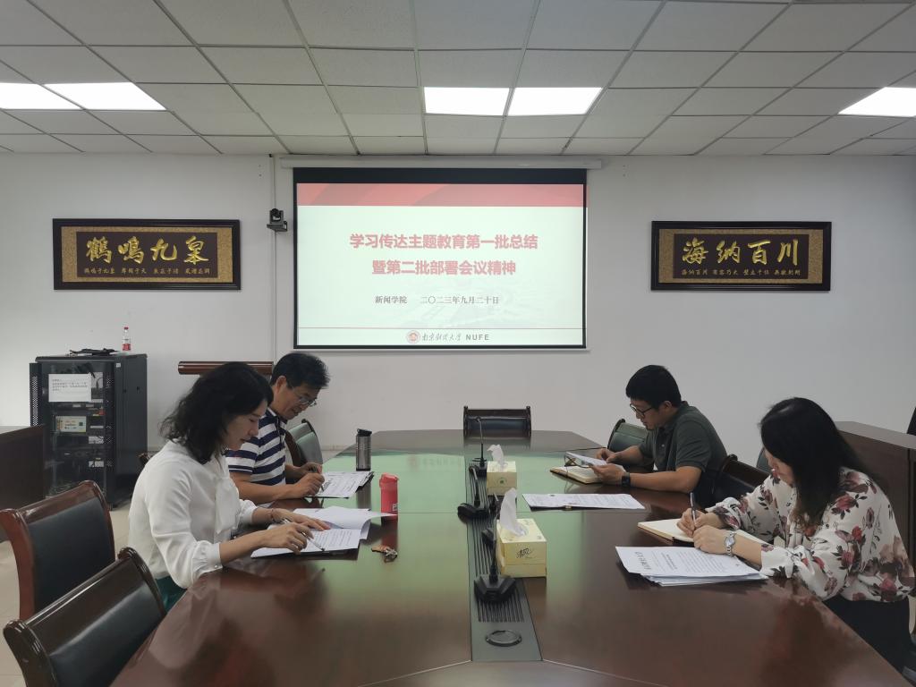 陈丹书记传达学习中央主题教育第一批总结暨第二批部署会议精神。同时传达校党委书记张利民就深入学习中央主题教育第一批总结暨第二批部署会议精神提出的三点意见:一要提高政治站位,强化理论学习;二要坚决扛起责任,提高业务水平;三要扎实做好“后半篇文章”,推动主题教育走深走实。新闻学院党总支领导班子成员交流学习体会。